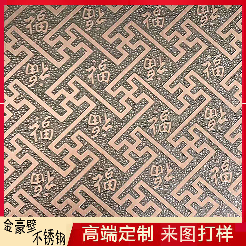可供選擇的顏色繁多,有玫瑰色古銅色黑色香檳色咖啡色紫紅色寶石藍色青古銅色紅銅色黃銅色等等,應有盡有。可供選擇的外表工藝種類也多種多樣,底板以8K鏡面、拉絲等工藝為主,再加上拉絲、和紋等復雜工藝,使得不銹鋼花紋板的表面紋理清晰、明暗相間,細節處精美華麗。