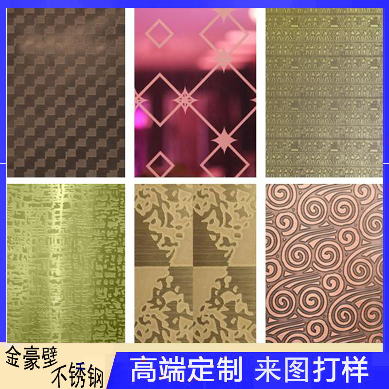 不銹鋼花紋板具有許多效果。簡單如:清彤蝕刻深綠色,凹凸方形圖案似乎讓你生活在三維空間,藍寶石藍色不銹鋼蝕刻就像在藍色的海浪中跳舞,金色的線條以簡單慷慨的方式刻蝕。鈮鈦蝕刻不失調皮,復雜的圖案也可以蝕刻出,已經通過蝕刻工藝產生馳騁的奔馬,清明河的河邊地圖,以及花園的春季降雪。蝕刻過程不會在暴雨和潮濕的環境中褪色或生銹。它可以存放很長時間,是最理想的裝飾材料。