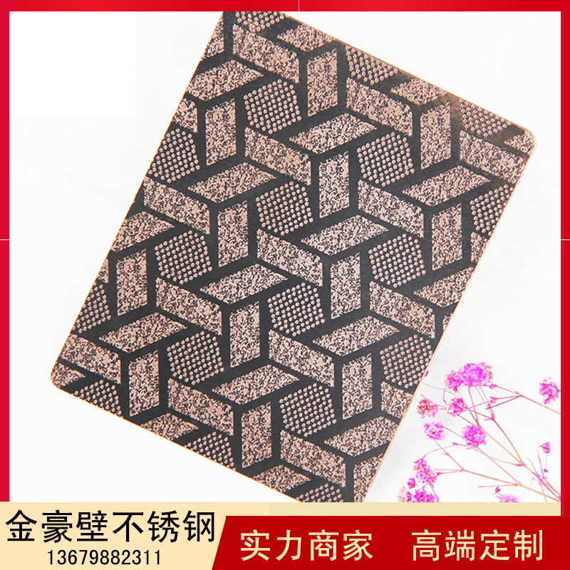 不銹鋼花紋板與前一段時間給大家介紹的不銹鋼表面處理有著密不可分的關系,不銹鋼花紋板是以鏡面板、拉絲板、噴砂板為底板,再根據您所要求的花紋圖案或者文字進行蝕刻處理,當然如果您不需要進行蝕刻花紋的還可以進行局部的和紋喔!