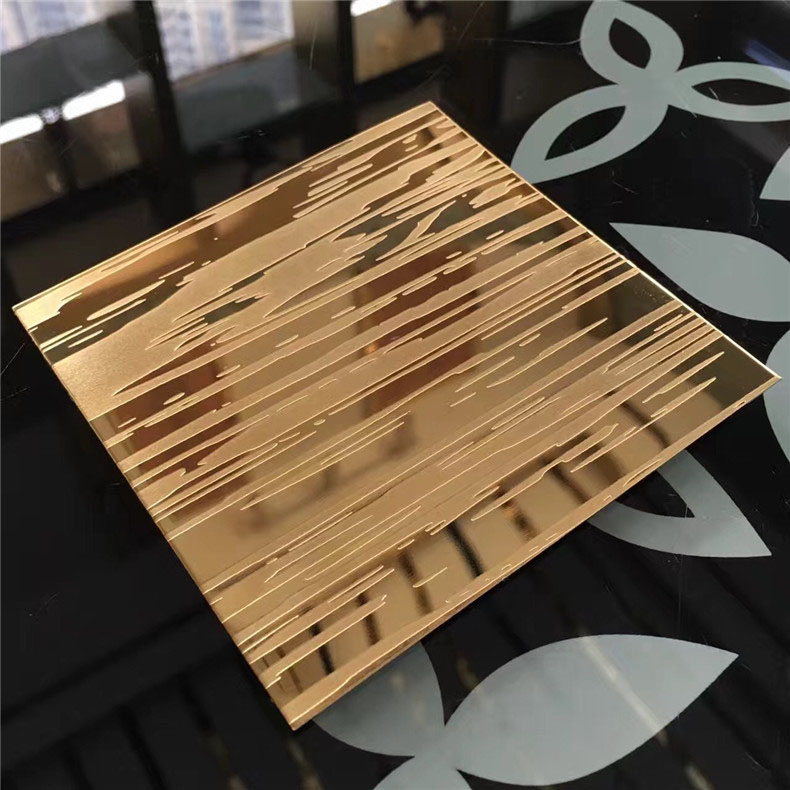 不銹鋼蝕刻板是在不銹鋼表面通過化學的方法,腐蝕出各種花紋圖案。以8K鏡面板、拉絲板、噴砂板為底板,進行蝕刻處理后,對物體表面再進行深加工,不銹鋼蝕刻板可進行局部的和紋,拉絲,嵌金,局部鈦金等各式復雜工藝處理,不銹鋼蝕刻板實現圖案明暗相間,色彩絢麗的效果。