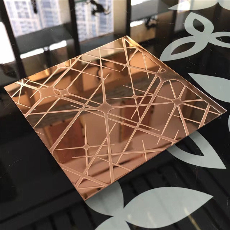 不銹鋼蝕刻板是在不銹鋼表面通過化學的方法,腐蝕出各種花紋圖案。以8K鏡面板、拉絲板、噴砂板為底板,進行蝕刻處理后,對物體表面再進行深加工,不銹鋼蝕刻板可進行局部的和紋,拉絲,嵌金,局部鈦金等各式復雜工藝處理,不銹鋼蝕刻板實現(xiàn)圖案明暗相間,色彩絢麗的效果。